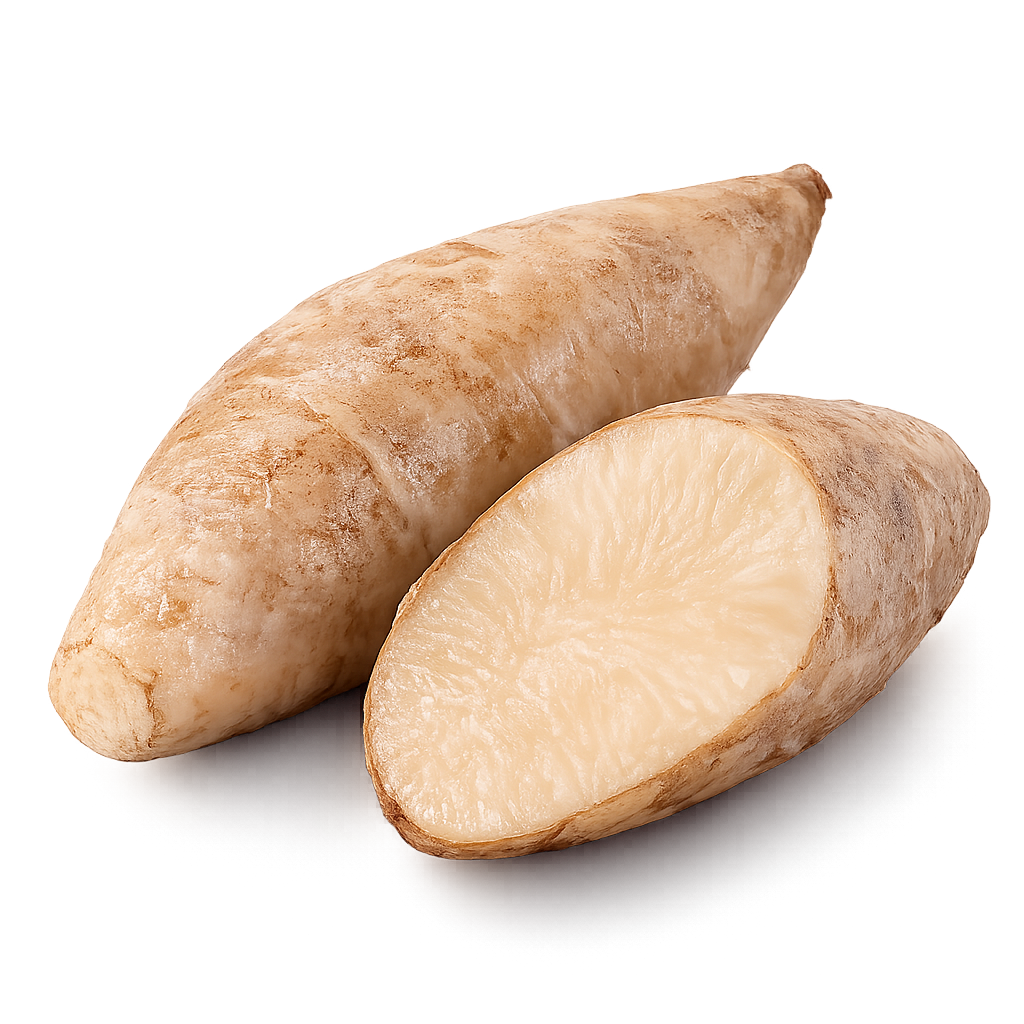 A boiled yacon root with high moisture, moderate carbohydrate value, potassium, folate, and mild prebiotic character