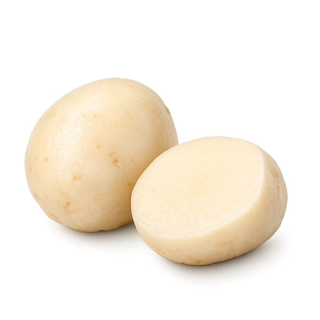 A peeled raw potato tuber providing starch, potassium, vitamin C, vitamin B6, and dietary fiber