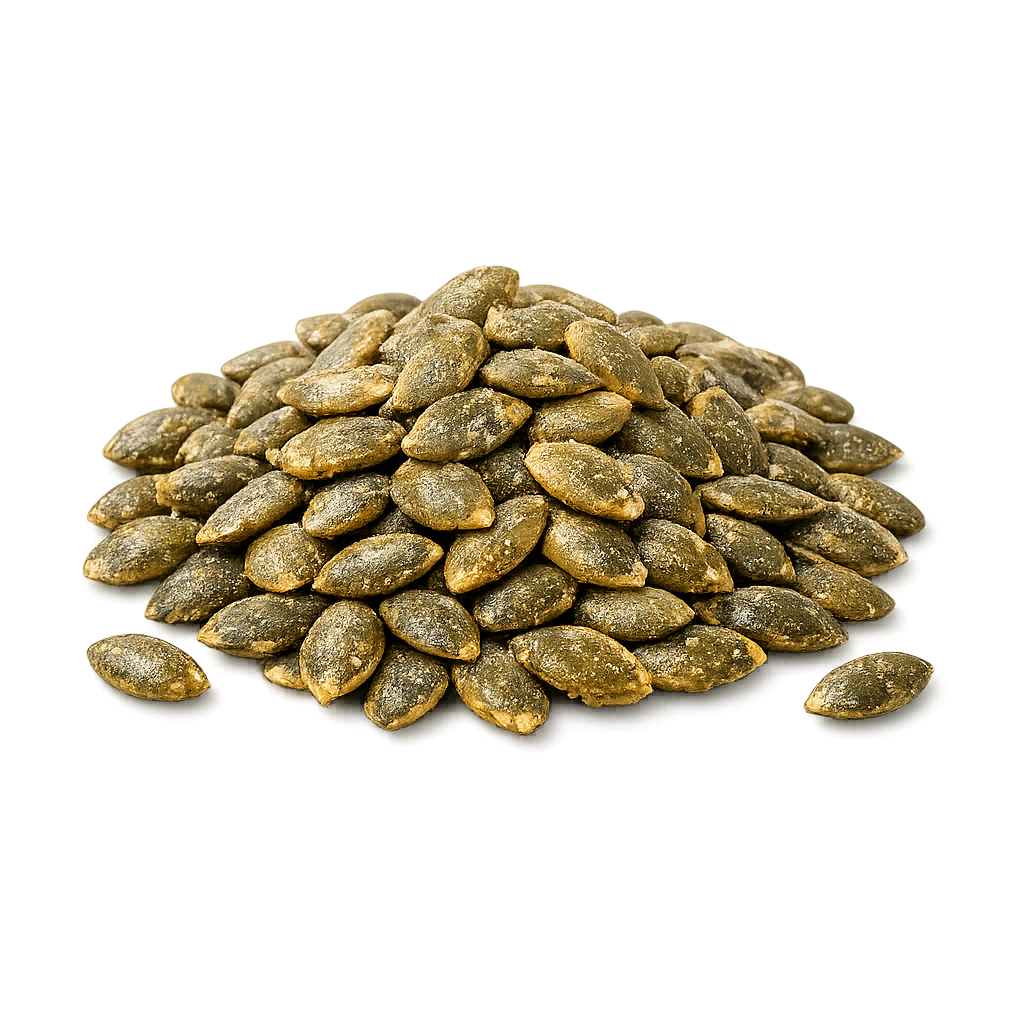 Roasted pumpkin seeds seasoned with salt, acting as a potent source of magnesium, zinc, and healthy plant-based fats.