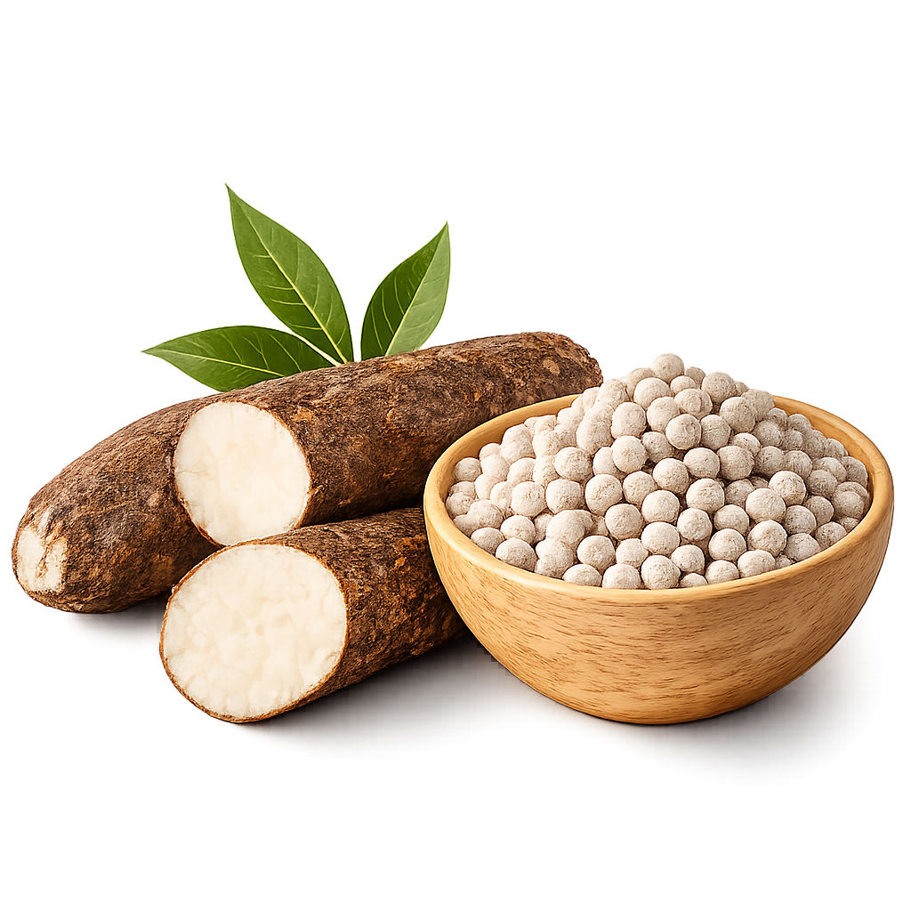 A dried cassava-starch pearl product with very high carbohydrate and minimal protein or fiber